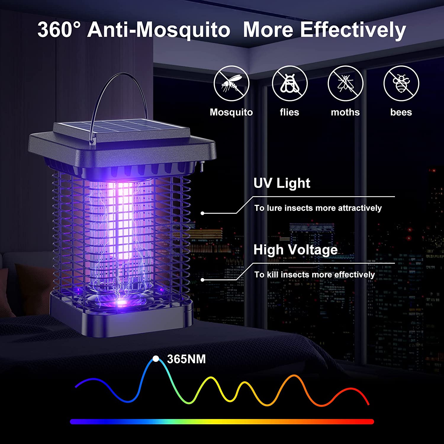 - 【Powerful and Efficient Mosquito Killer】 The bug zapper uses the thermal effect to simulate human body temperature in a wide range of 360°, and then releases ultraviolet light with a wavelength of 365NM and 4200V electric shock to attract mosquitoes, flies, moths, and other insects.