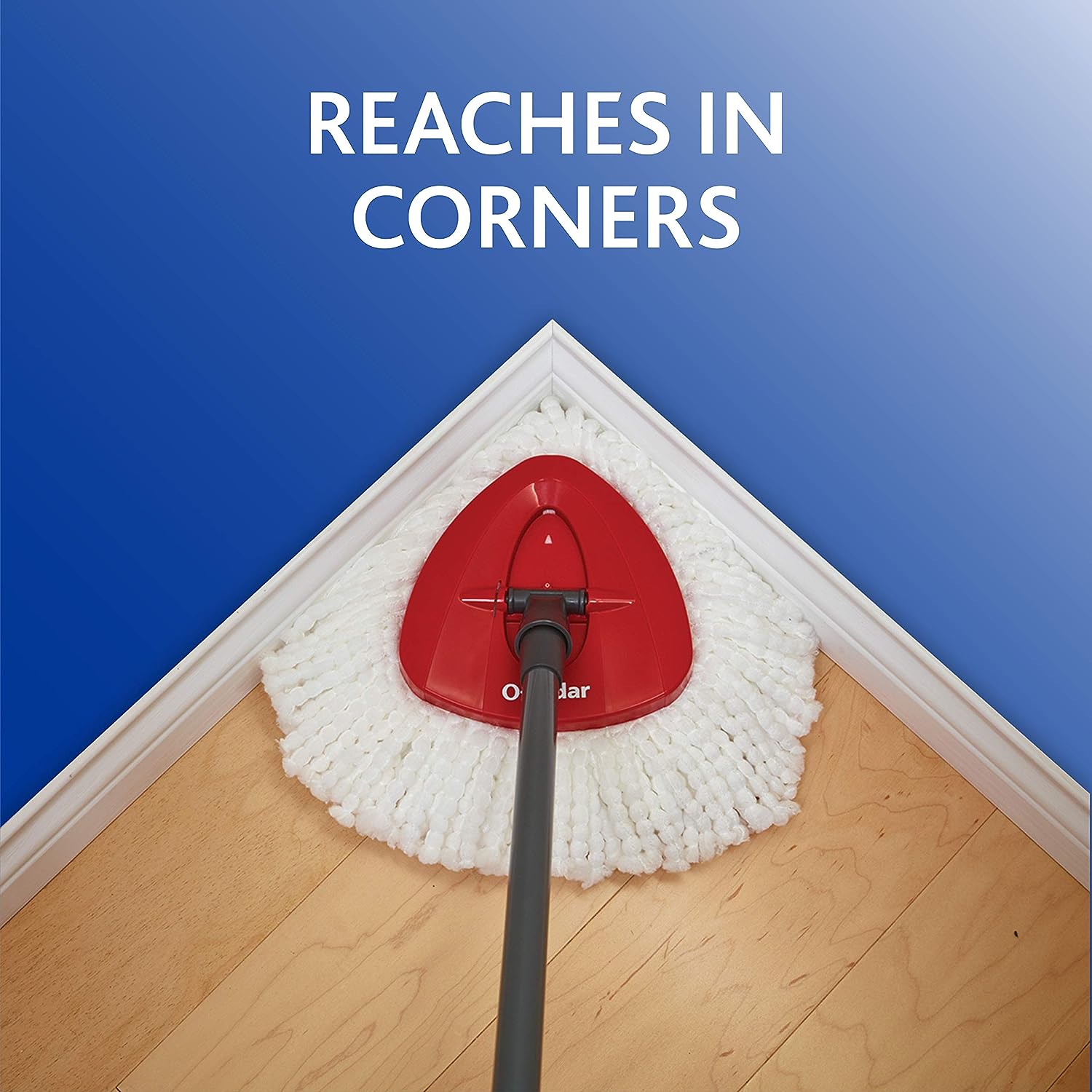 - REACHES IN CORNERS: Due to the patented triangle mop-head and ability to rotate 360 degrees, the EasyWring Mop can reach and clean deep into corners, under furniture, alongside baseboards, and between tile.