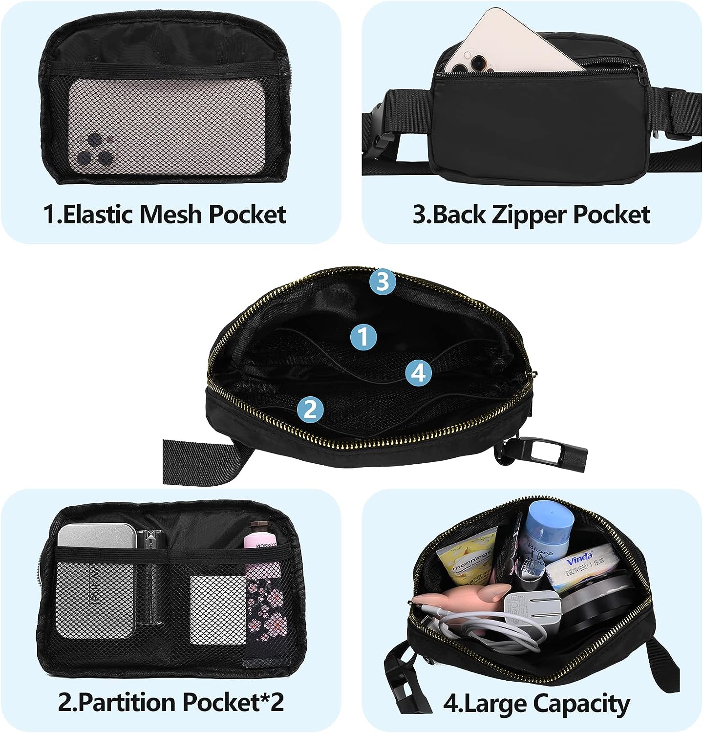 - Large Capacity: The Belt packs have one main pocket + back pocket + big insert bag +insert card pocket*2. You can put your mobile phone, key, headset, headset, sunglasses, cosmetics, wallets, passports, etc.